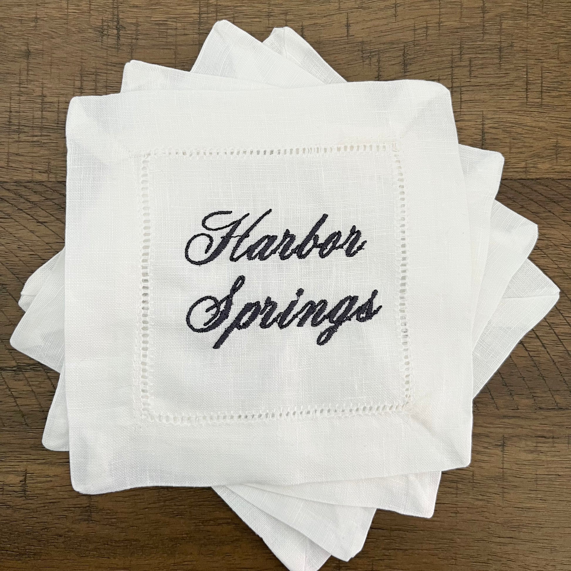 Harbor Springs, Custom City, or Text Embroidered Linen Cocktail Napkin