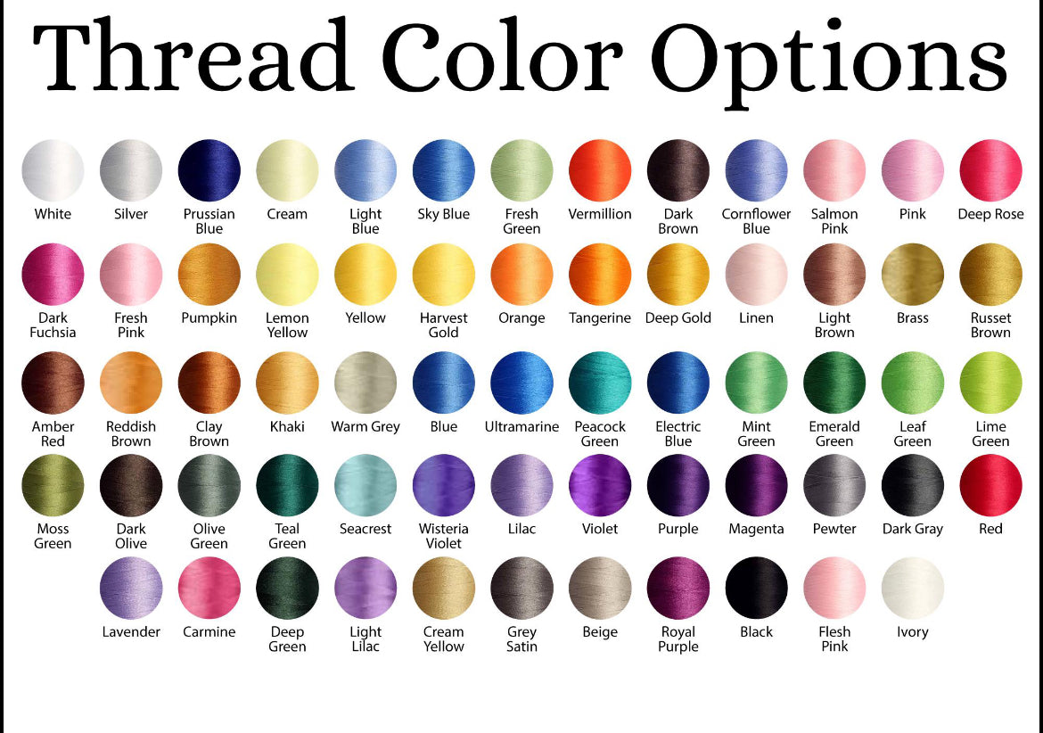 - Custom embroidery in your choice of thread color and font