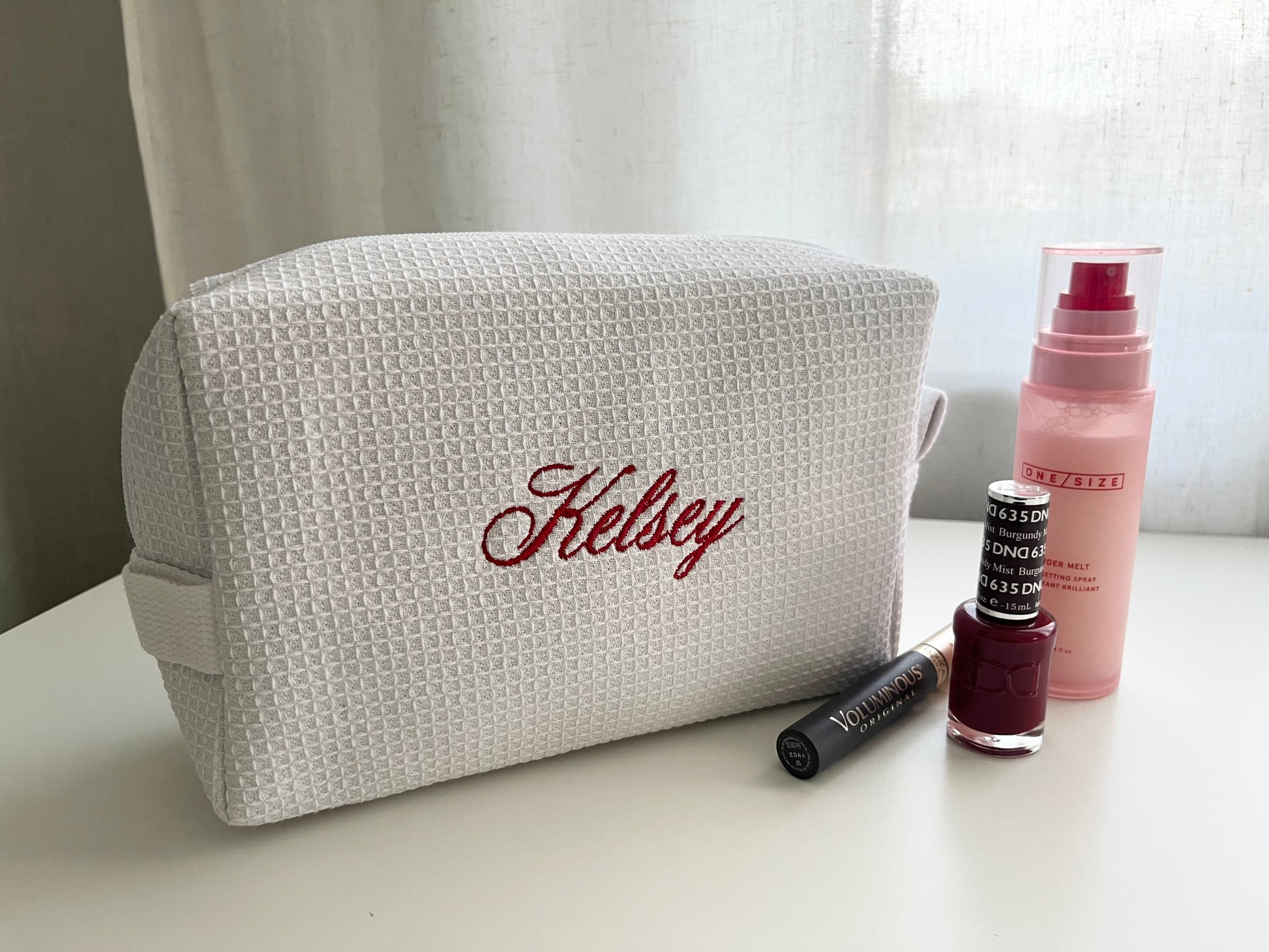 Add a personal touch to your daily routine with our custom embroidered waffle-knit cosmetic bag — a chic, textured pouch that’s perfect for keeping your essentials organized. Whether it’s filled with skincare must-haves, makeup favorites, or your favorite grippy socks for Pilates, this bag is as versatile as it is beautiful.